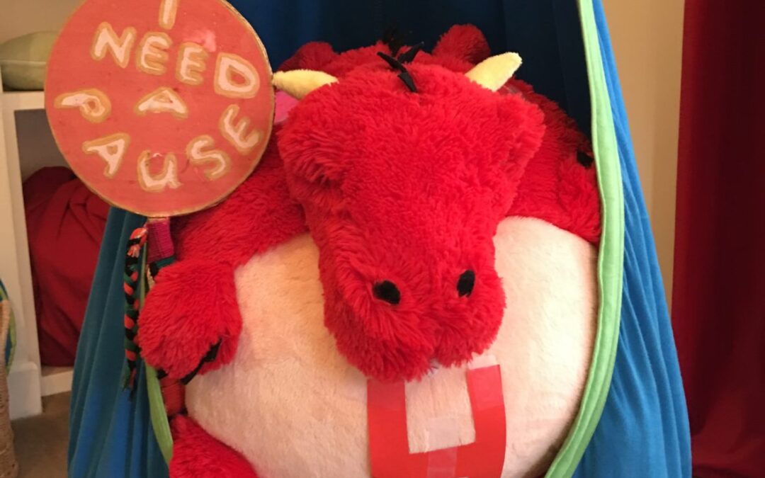 I made the ‘Pause paddle’ – sticking out of the side of the pouch with ‘I need a Pause’ painted on it – at the request of one of my clients several years ago. When a new family comes in with their child I point out the Pause paddle to everyone and say, “You can pick that up anytime if you need a break, a rest, or a Pause and we’ll all stop and rest.” I explain the Pause in more detail to adults in their first session and to parents outside of the child-centered play session so the they can use it at home and practice it in the play sessions. The Pause gives you time to check in with yourself, slow down, or stop with no limit to the length of the Pause taken. It’s a great resource for regulating and settling your nervous system and dealing with triggers in the moment so that you, or your child, can return to a neutral calm state. You can also get support in the Pause.